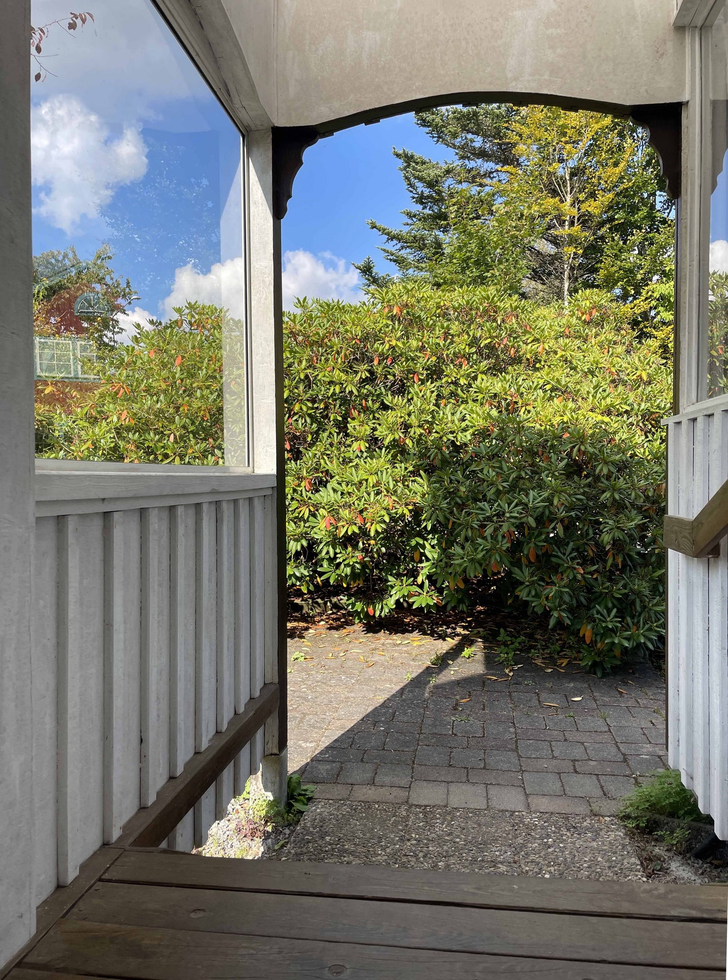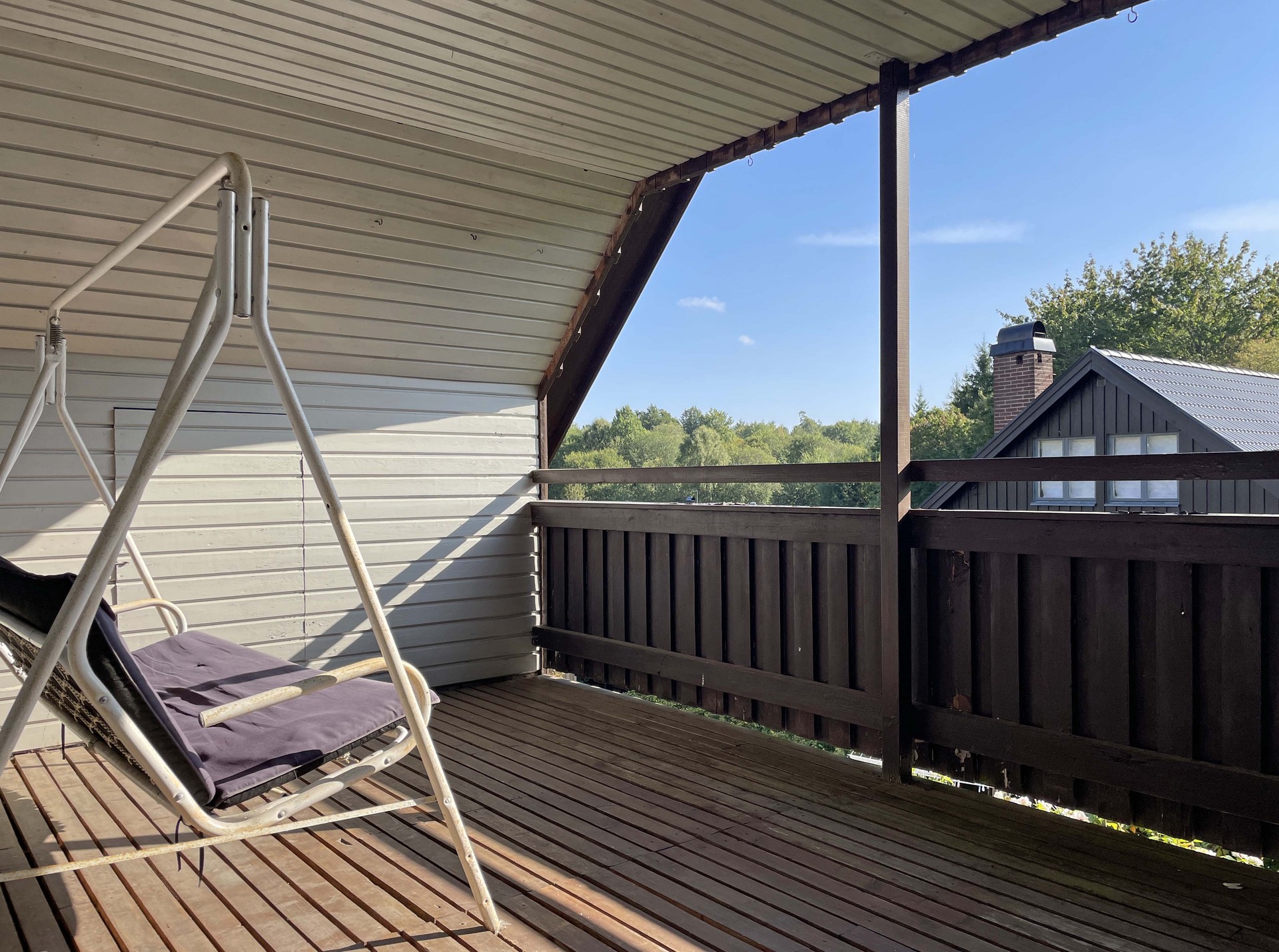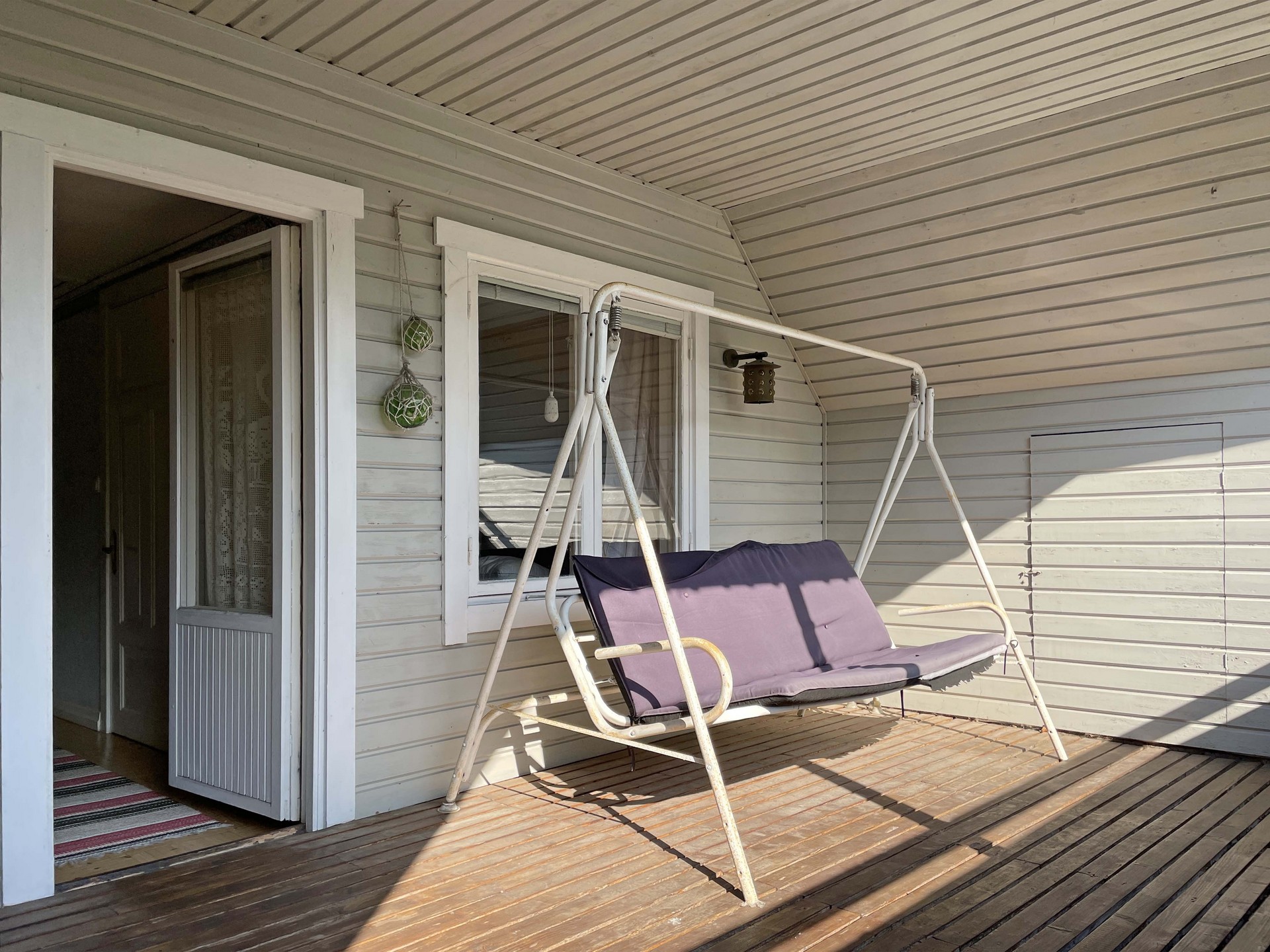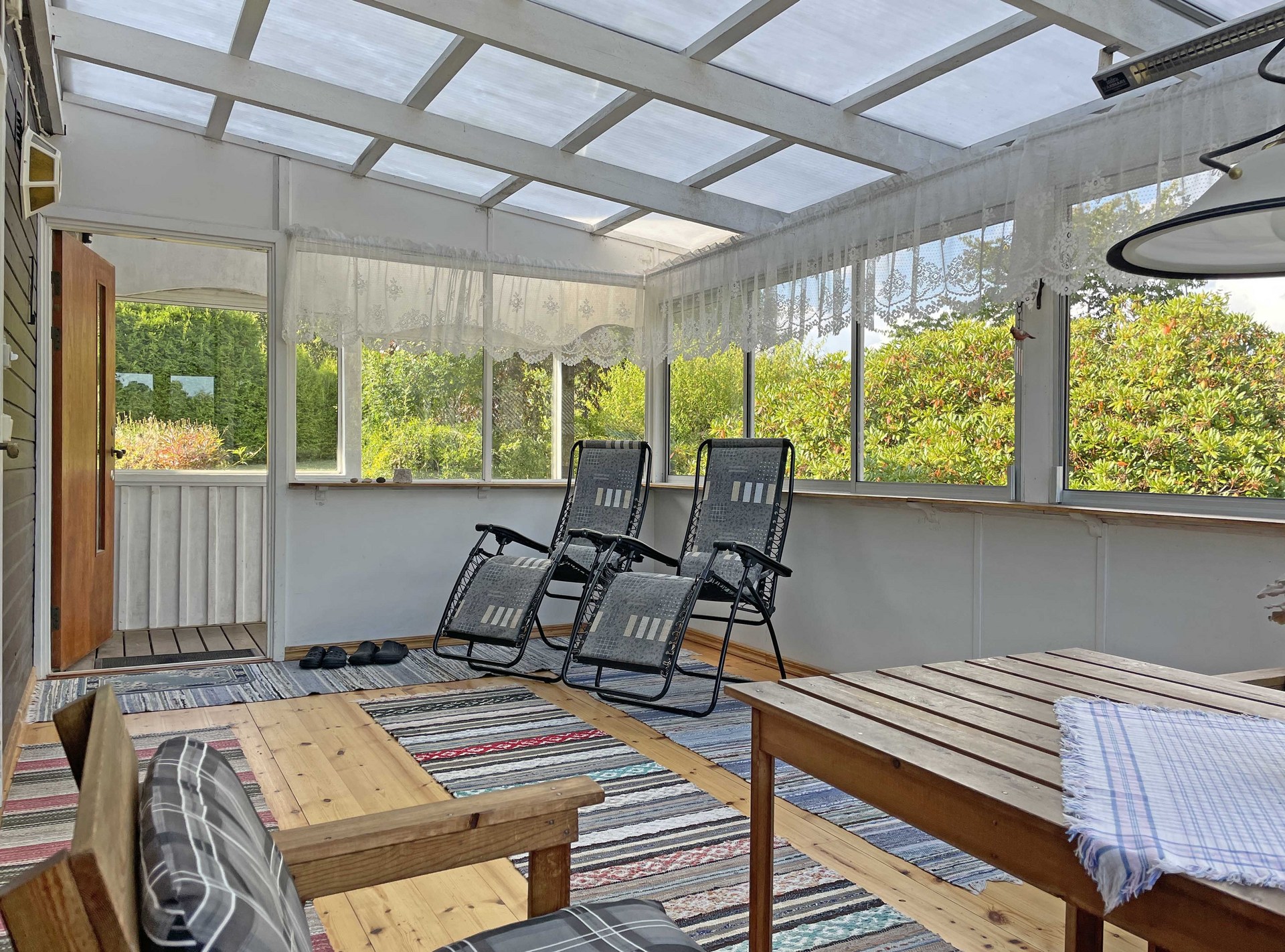 Halvinglasat uterum med tak av kanalplast. Öppningsbara (skjutbara) fönster längs med långsidan. Trägolv. Övre plan har en altan/rymlig balkong.