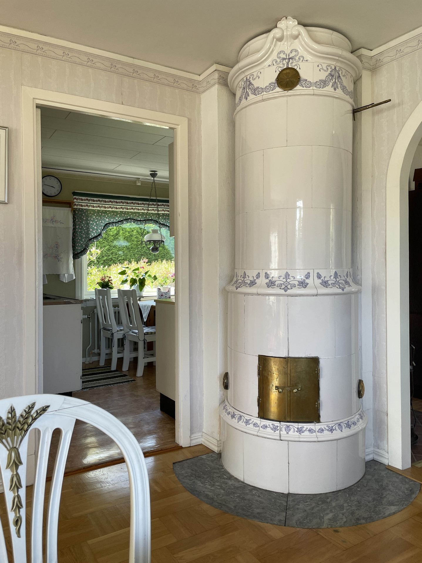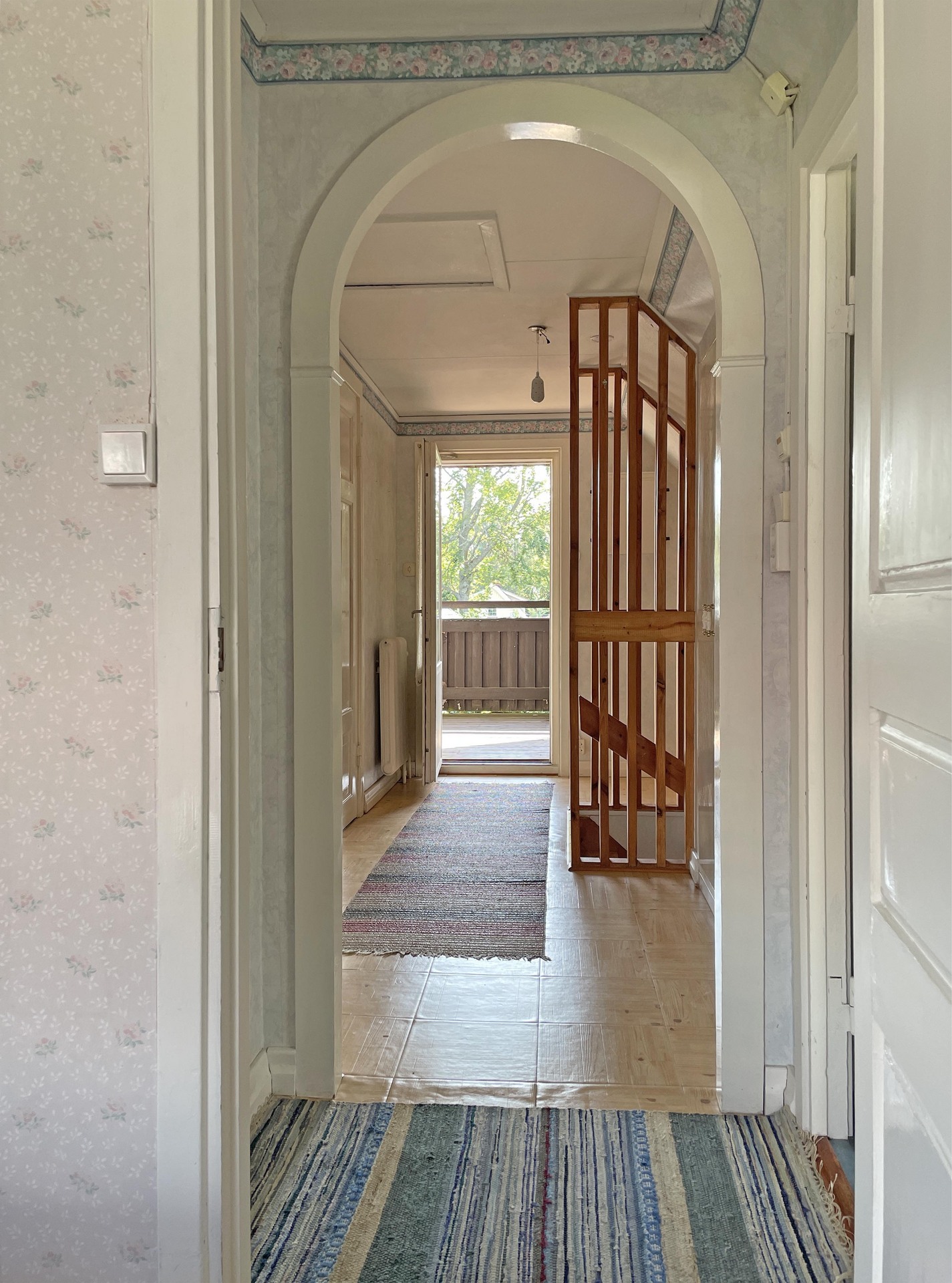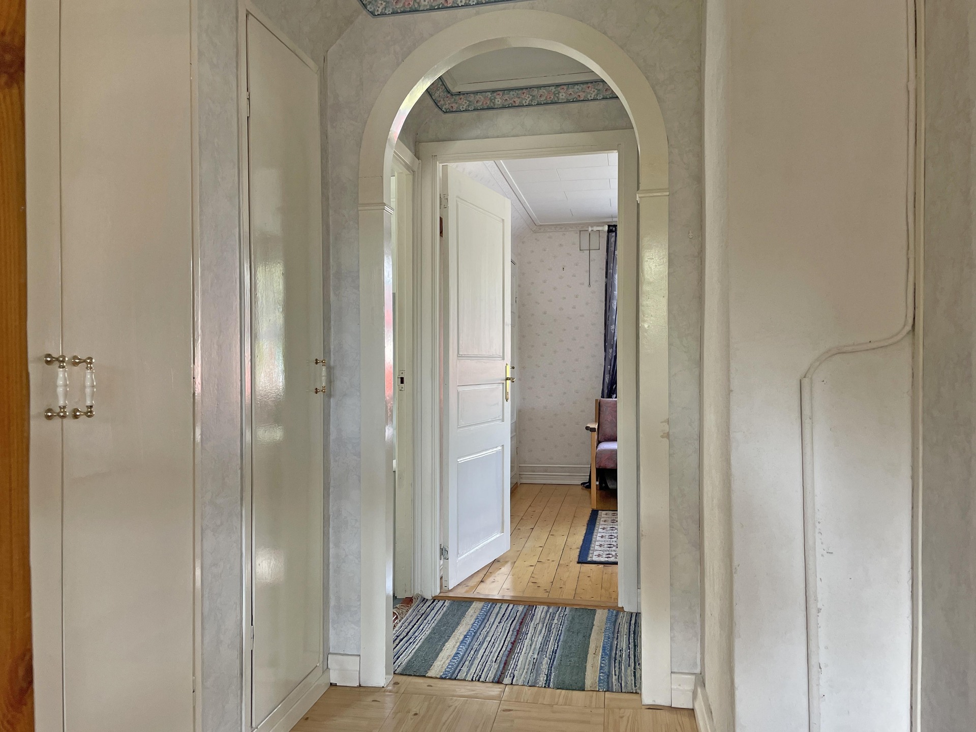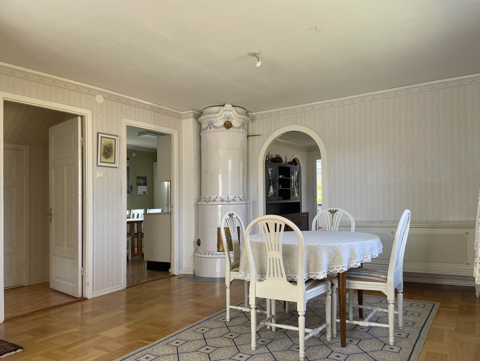 VÄLKOMMEN IN... ... till en mysig bostad med många fina detaljer. Spegeldörrar, kakelugn, parkett och charmiga vrår. ENTRÉPLAN har två/tre rum och kök samt uterum, hall och badrum. Entré under tak in genom uterummet. UTERUM med tak av kanalplast, trägolv och halvinglasade väggar. Ytterdörr in till huset. Ytterdörren leder in i vardagsrummet. Till höger genom ett valv finns en vrå för avhängning mellan vardagsrummet och badrummet. VARDAGSRUM med gjutjärnskamin och en täljsten på toppen. Tegelvägg bakom kaminen och klinker på golvet under. I övrigt tapetserade väggar och plastmatta på golvet. Fönster ut mot uterummet och mot öster. Ett valv leder in till finrummet. BADRUM med våtrumstapet och -matta. Handfat med kommod och spegelskåp, WC samt duschväggar. Badrumsfläkt. FINRUM med parkett och väldigt vacker kakelugn. Kakelugnen behöver åtgärdas men förhöjer rummets karaktär med sin prakt. Finrummet har öppnats upp och är nu två rum i ett. Den bortre delen kan delas av om man behöver ett sovrum till. Fönster mot öster och ett stort fönsterparti med 3-glasfönster mot syd. Dörrar till kök och till hall. KÖK med plats för ca 4 personer. Kakel över diskbänk och bänkskiva av laminat. Spis med ugn, glashäll Cylinda, Fläkt Franke, Kylskåp och Frysskåp Cylinda. Tapetserade väggar, plastmatta. 3-glasfönster mot väster, HALL med trappa till övre plan och ytterdörr mot trädgården. Lämpligt som kontor. Förråd under trappan och garderobsvägg. Tapetserade väggar, plastmatta. ÖVRE PLAN har hall, två sovrum, badrum och en rymlig balkong/altan. HALL med en vrå till höger innan utgång till trädäck. I vrån finns förvaring. Rakt fram finns ett sovrum och till vänster passerar man förvaring på väg mot badrum och ytterligare ett sovrum. Tapetserade väggar och plastmatta i hallen. Förvaringen har dörrar. SOVRUM rakt fram har panelat snedtak och tapetserade väggar, plastmatta. Fönster i söderläge ut mot trädäcket. BALKONG/altan under tak i söderläge. Trall på golvet, panelade väggar. BADRUM med handfat, WC och badkar som går in under snedtak. Våtrumsmatta och -golv. Badrumsfläkt. Fönster mot väster. SOVRUM större med alkov. Två ina spegeldörrar till garderober/förvaring. Tapetserade väggar och trägolv. Treluftsfönster mot norr och fönster mot öster.
