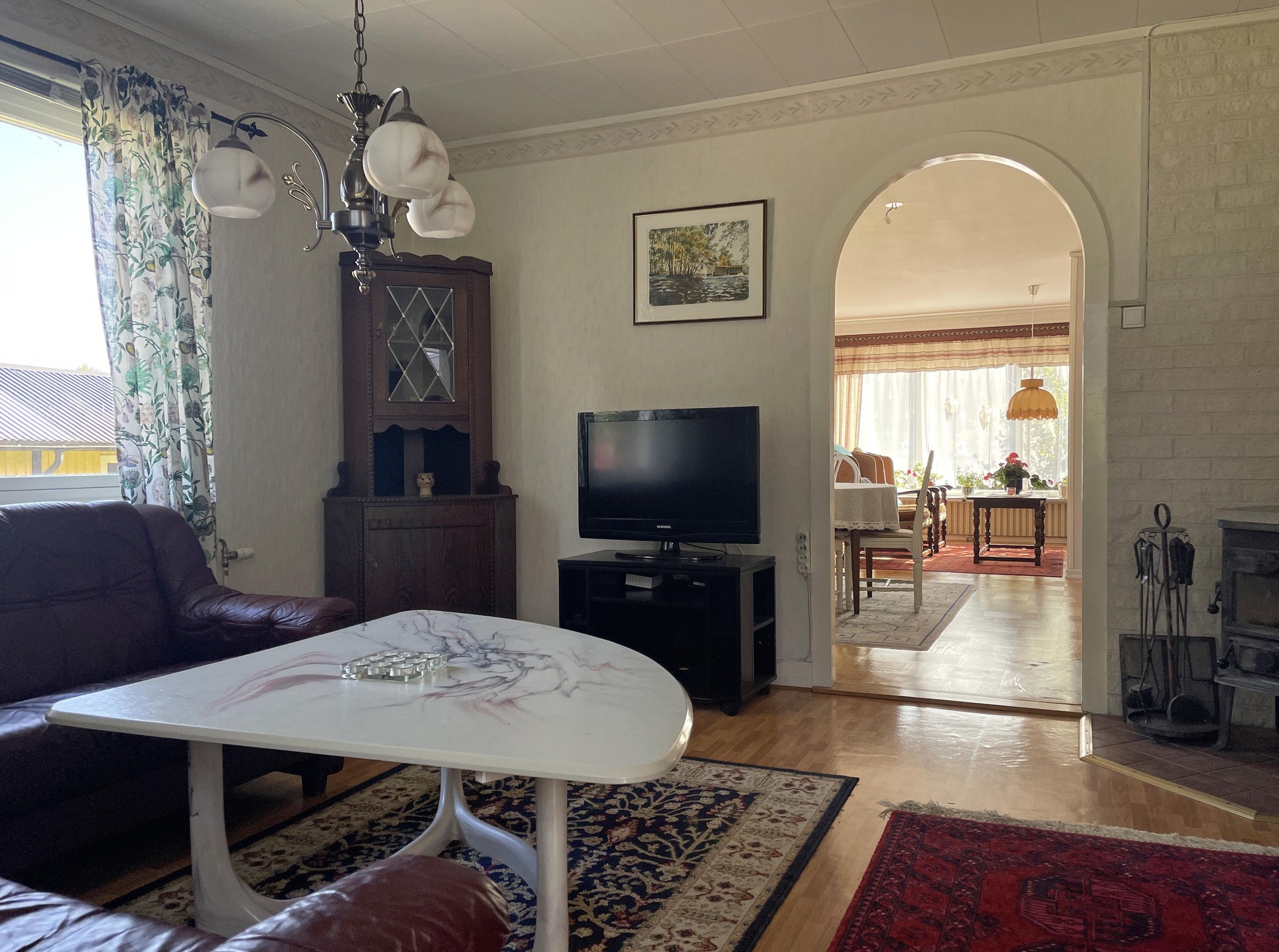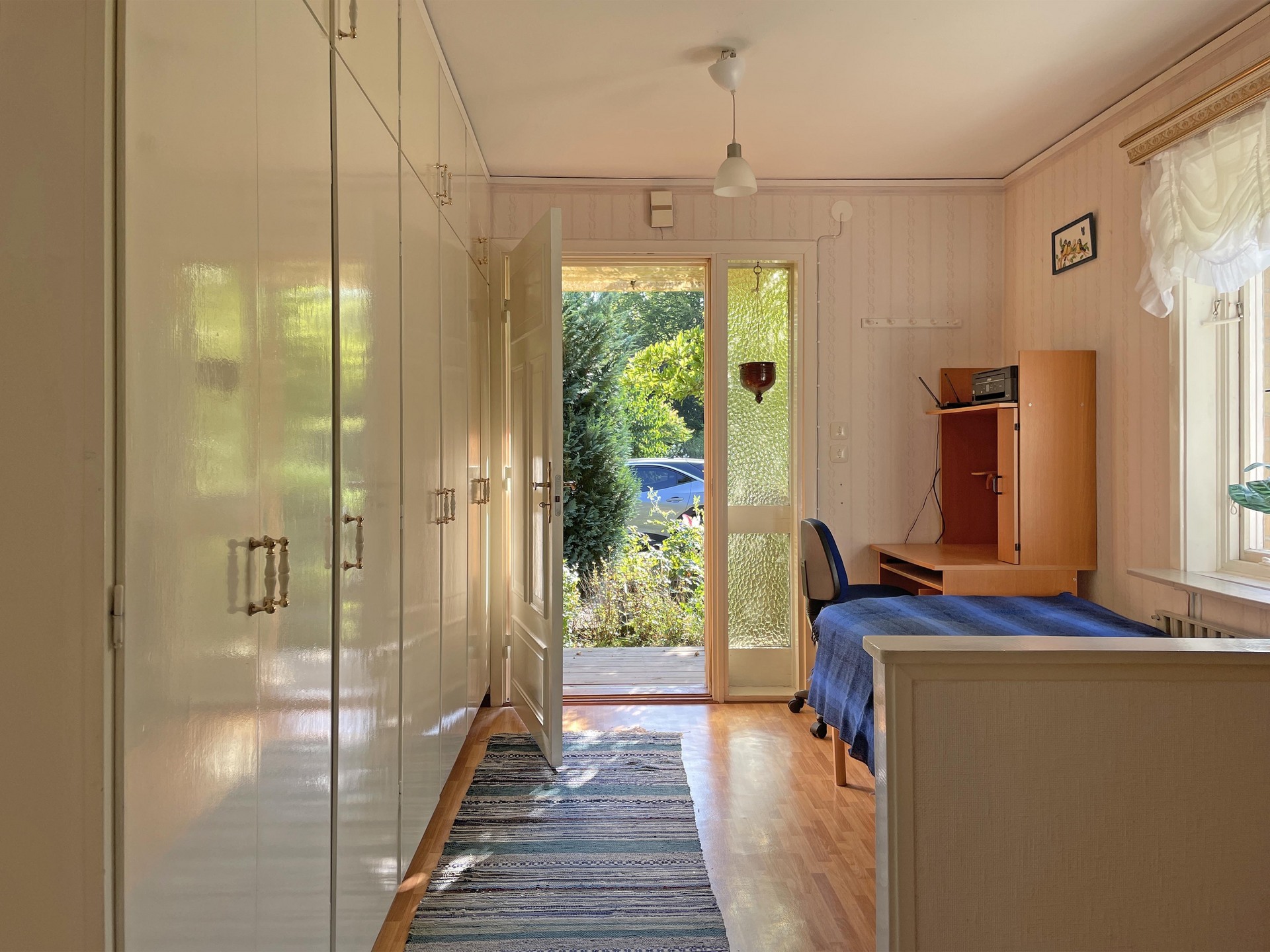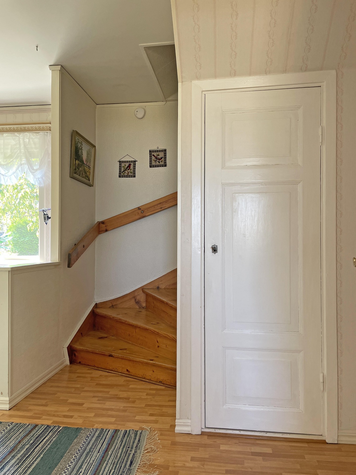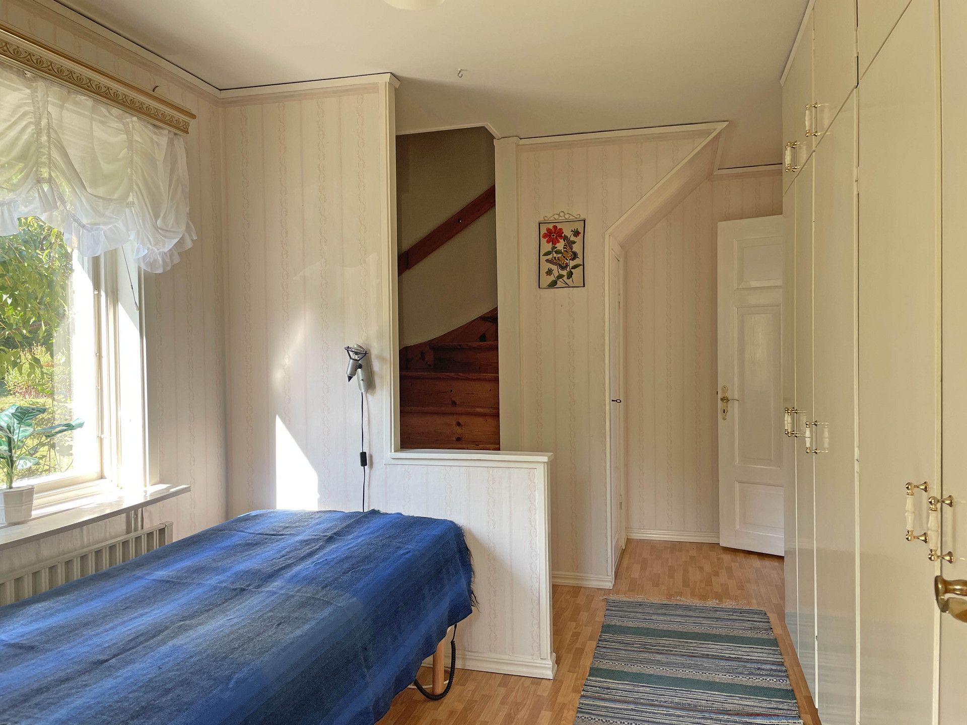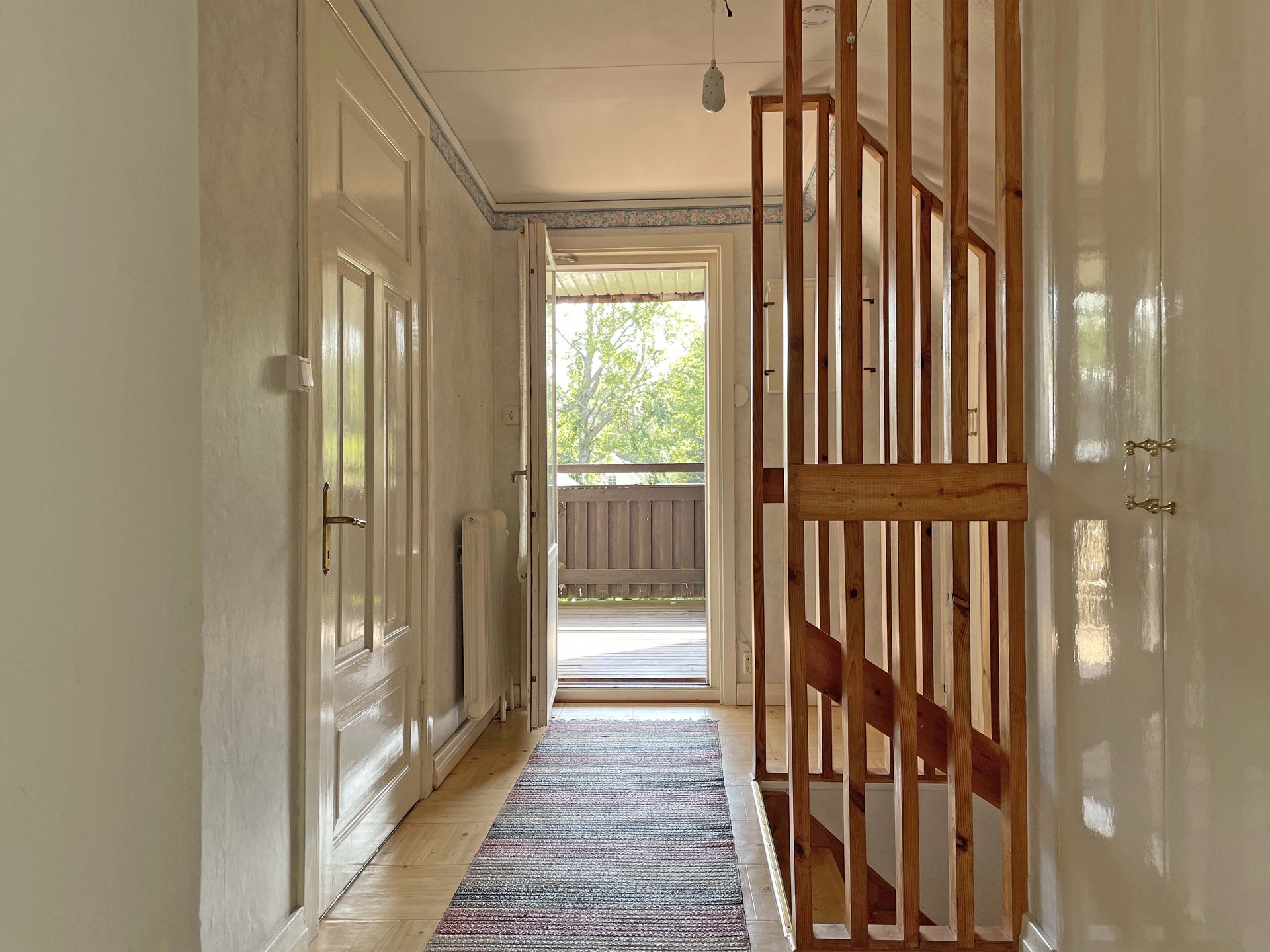 VÄLKOMMEN IN... ... till en mysig bostad med många fina detaljer. Spegeldörrar, kakelugn, parkett och charmiga vrår. ENTRÉPLAN har två/tre rum och kök samt uterum, hall och badrum. Entré under tak in genom uterummet. UTERUM med tak av kanalplast, trägolv och halvinglasade väggar. Ytterdörr in till huset. Ytterdörren leder in i vardagsrummet. Till höger genom ett valv finns en vrå för avhängning mellan vardagsrummet och badrummet. VARDAGSRUM med gjutjärnskamin och en täljsten på toppen. Tegelvägg bakom kaminen och klinker på golvet under. I övrigt tapetserade väggar och plastmatta på golvet. Fönster ut mot uterummet och mot öster. Ett valv leder in till finrummet. BADRUM med våtrumstapet och -matta. Handfat med kommod och spegelskåp, WC samt duschväggar. Badrumsfläkt. FINRUM med parkett och väldigt vacker kakelugn. Kakelugnen behöver åtgärdas men förhöjer rummets karaktär med sin prakt. Finrummet har öppnats upp och är nu två rum i ett. Den bortre delen kan delas av om man behöver ett sovrum till. Fönster mot öster och ett stort fönsterparti med 3-glasfönster mot syd. Dörrar till kök och till hall. KÖK med plats för ca 4 personer. Kakel över diskbänk och bänkskiva av laminat. Spis med ugn, glashäll Cylinda, Fläkt Franke, Kylskåp och Frysskåp Cylinda. Tapetserade väggar, plastmatta. 3-glasfönster mot väster, HALL med trappa till övre plan och ytterdörr mot trädgården. Lämpligt som kontor. Förråd under trappan och garderobsvägg. Tapetserade väggar, plastmatta. ÖVRE PLAN har hall, två sovrum, badrum och en rymlig balkong/altan. HALL med en vrå till höger innan utgång till trädäck. I vrån finns förvaring. Rakt fram finns ett sovrum och till vänster passerar man förvaring på väg mot badrum och ytterligare ett sovrum. Tapetserade väggar och plastmatta i hallen. Förvaringen har dörrar. SOVRUM rakt fram har panelat snedtak och tapetserade väggar, plastmatta. Fönster i söderläge ut mot trädäcket. BALKONG/altan under tak i söderläge. Trall på golvet, panelade väggar. BADRUM med handfat, WC och badkar som går in under snedtak. Våtrumsmatta och -golv. Badrumsfläkt. Fönster mot väster. SOVRUM större med alkov. Två ina spegeldörrar till garderober/förvaring. Tapetserade väggar och trägolv. Treluftsfönster mot norr och fönster mot öster.