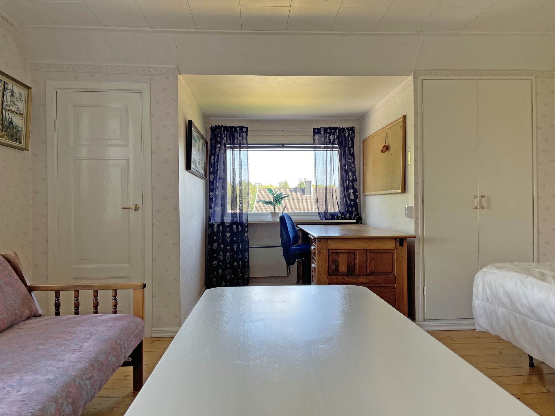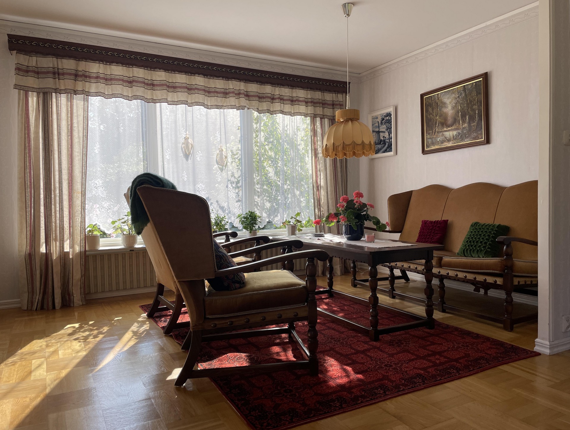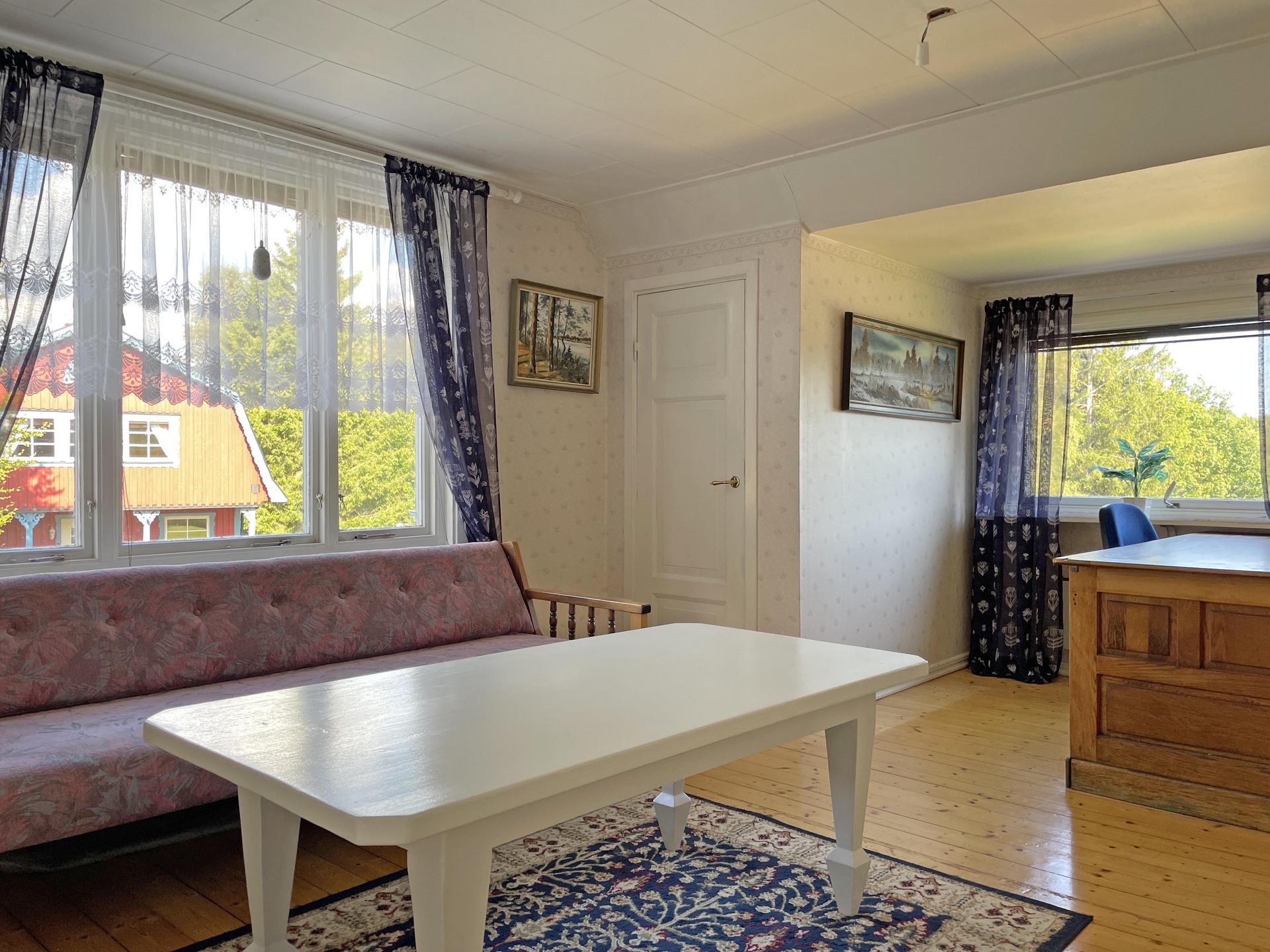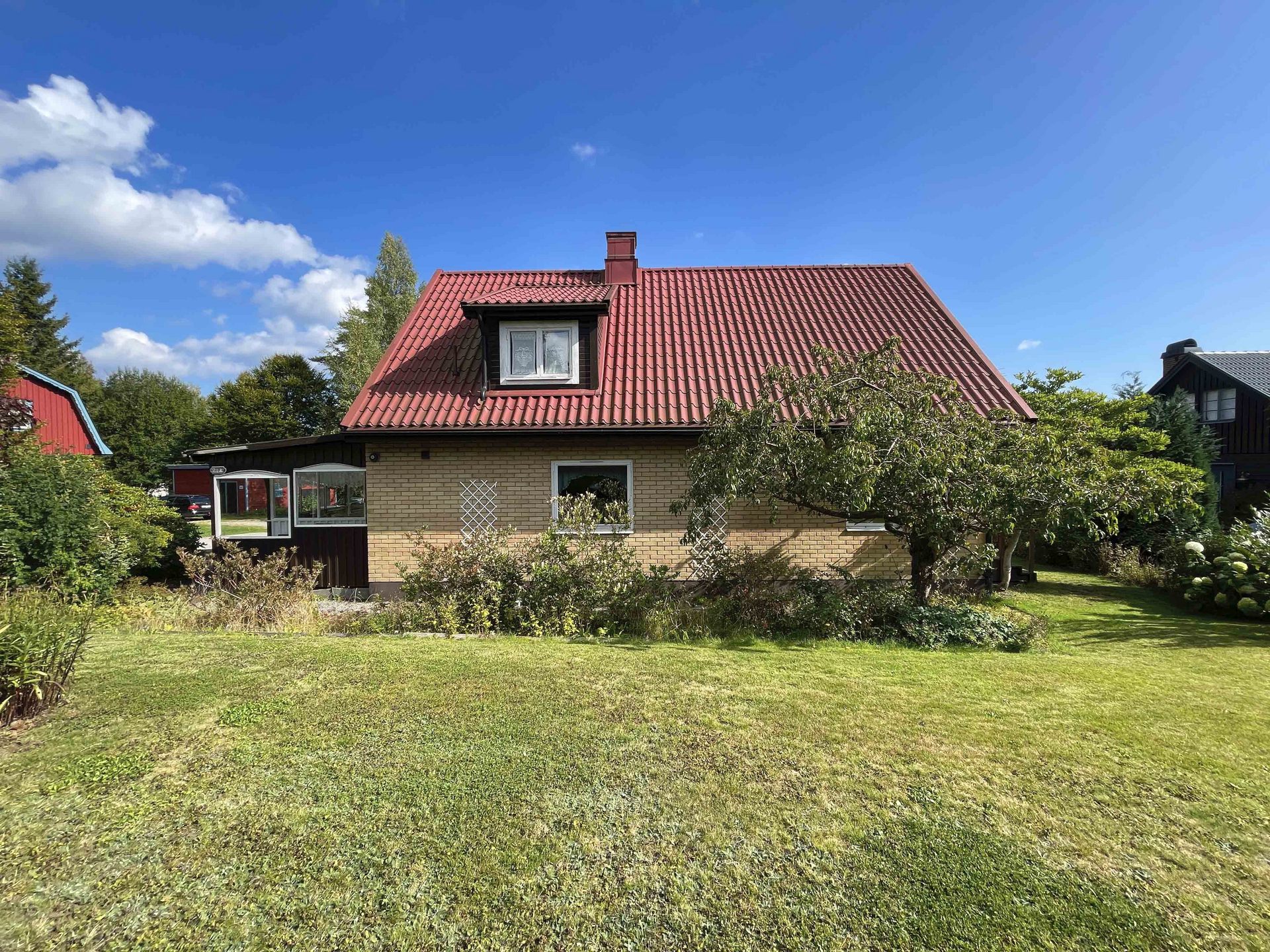 VÄLKOMMEN IN... ... till en mysig bostad med många fina detaljer. Spegeldörrar, kakelugn, parkett och charmiga vrår. ENTRÉPLAN har två/tre rum och kök samt uterum, hall och badrum. Entré under tak in genom uterummet. UTERUM med tak av kanalplast, trägolv och halvinglasade väggar. Ytterdörr in till huset. Ytterdörren leder in i vardagsrummet. Till höger genom ett valv finns en vrå för avhängning mellan vardagsrummet och badrummet. VARDAGSRUM med gjutjärnskamin och en täljsten på toppen. Tegelvägg bakom kaminen och klinker på golvet under. I övrigt tapetserade väggar och plastmatta på golvet. Fönster ut mot uterummet och mot öster. Ett valv leder in till finrummet. BADRUM med våtrumstapet och -matta. Handfat med kommod och spegelskåp, WC samt duschväggar. Badrumsfläkt. FINRUM med parkett och väldigt vacker kakelugn. Kakelugnen behöver åtgärdas men förhöjer rummets karaktär med sin prakt. Finrummet har öppnats upp och är nu två rum i ett. Den bortre delen kan delas av om man behöver ett sovrum till. Fönster mot öster och ett stort fönsterparti med 3-glasfönster mot syd. Dörrar till kök och till hall. KÖK med plats för ca 4 personer. Kakel över diskbänk och bänkskiva av laminat. Spis med ugn, glashäll Cylinda, Fläkt Franke, Kylskåp och Frysskåp Cylinda. Tapetserade väggar, plastmatta. 3-glasfönster mot väster, HALL med trappa till övre plan och ytterdörr mot trädgården. Lämpligt som kontor. Förråd under trappan och garderobsvägg. Tapetserade väggar, plastmatta. ÖVRE PLAN har hall, två sovrum, badrum och en rymlig balkong/altan. HALL med en vrå till höger innan utgång till trädäck. I vrån finns förvaring. Rakt fram finns ett sovrum och till vänster passerar man förvaring på väg mot badrum och ytterligare ett sovrum. Tapetserade väggar och plastmatta i hallen. Förvaringen har dörrar. SOVRUM rakt fram har panelat snedtak och tapetserade väggar, plastmatta. Fönster i söderläge ut mot trädäcket. BALKONG/altan under tak i söderläge. Trall på golvet, panelade väggar. BADRUM med handfat, WC och badkar som går in under snedtak. Våtrumsmatta och -golv. Badrumsfläkt. Fönster mot väster. SOVRUM större med alkov. Två ina spegeldörrar till garderober/förvaring. Tapetserade väggar och trägolv. Treluftsfönster mot norr och fönster mot öster.