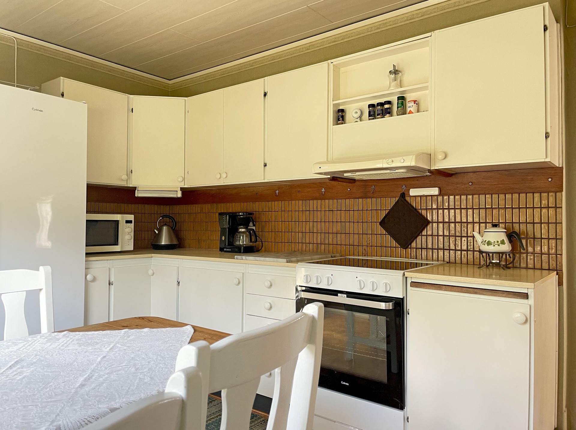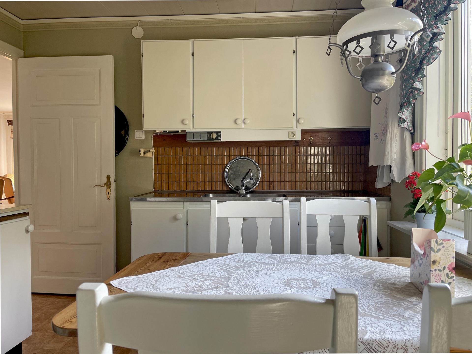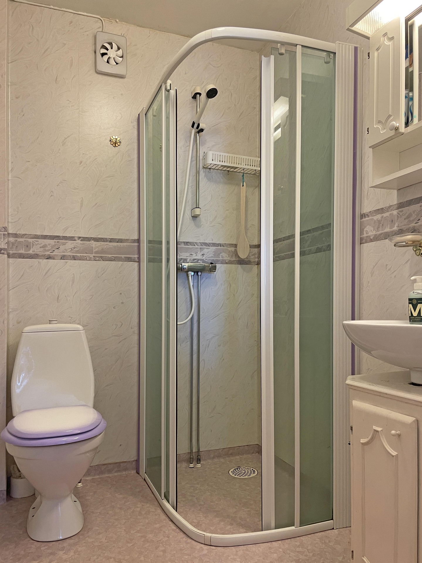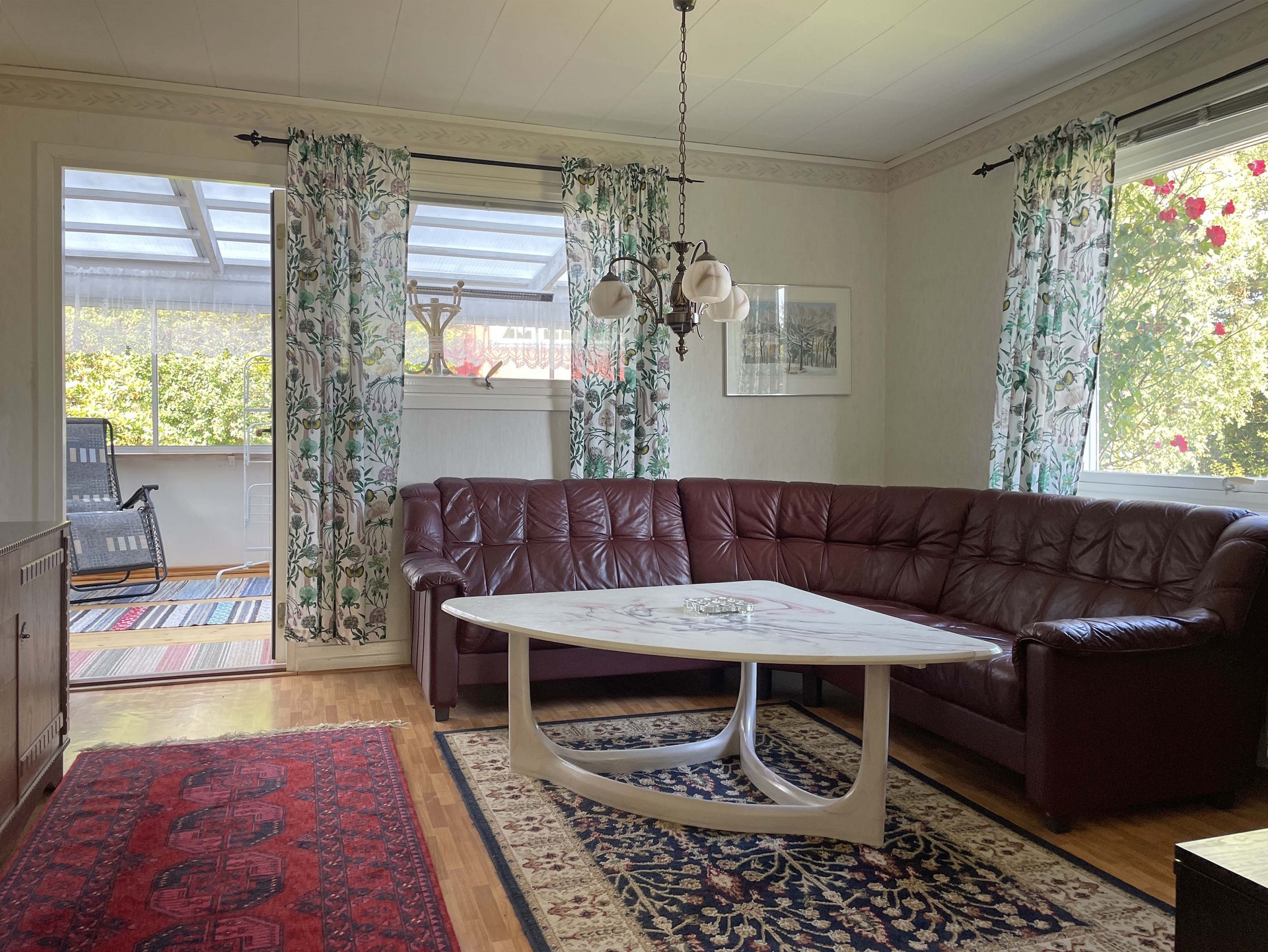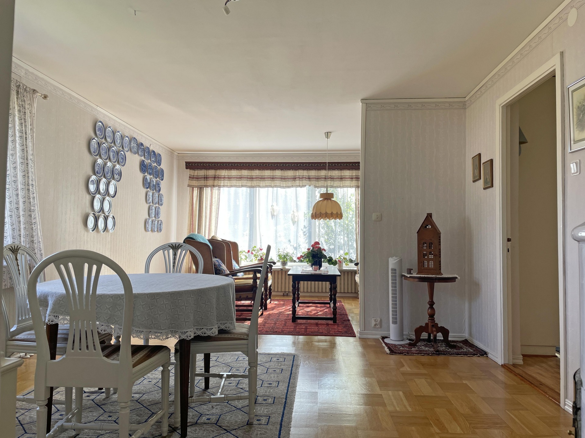 VÄLKOMMEN IN... ... till en mysig bostad med många fina detaljer. Spegeldörrar, kakelugn, parkett och charmiga vrår. ENTRÉPLAN har två/tre rum och kök samt uterum, hall och badrum. Entré under tak in genom uterummet. UTERUM med tak av kanalplast, trägolv och halvinglasade väggar. Ytterdörr in till huset. Ytterdörren leder in i vardagsrummet. Till höger genom ett valv finns en vrå för avhängning mellan vardagsrummet och badrummet. VARDAGSRUM med gjutjärnskamin och en täljsten på toppen. Tegelvägg bakom kaminen och klinker på golvet under. I övrigt tapetserade väggar och plastmatta på golvet. Fönster ut mot uterummet och mot öster. Ett valv leder in till finrummet. BADRUM med våtrumstapet och -matta. Handfat med kommod och spegelskåp, WC samt duschväggar. Badrumsfläkt. FINRUM med parkett och väldigt vacker kakelugn. Kakelugnen behöver åtgärdas men förhöjer rummets karaktär med sin prakt. Finrummet har öppnats upp och är nu två rum i ett. Den bortre delen kan delas av om man behöver ett sovrum till. Fönster mot öster och ett stort fönsterparti med 3-glasfönster mot syd. Dörrar till kök och till hall. KÖK med plats för ca 4 personer. Kakel över diskbänk och bänkskiva av laminat. Spis med ugn, glashäll Cylinda, Fläkt Franke, Kylskåp och Frysskåp Cylinda. Tapetserade väggar, plastmatta. 3-glasfönster mot väster, HALL med trappa till övre plan och ytterdörr mot trädgården. Lämpligt som kontor. Förråd under trappan och garderobsvägg. Tapetserade väggar, plastmatta. ÖVRE PLAN har hall, två sovrum, badrum och en rymlig balkong/altan. HALL med en vrå till höger innan utgång till trädäck. I vrån finns förvaring. Rakt fram finns ett sovrum och till vänster passerar man förvaring på väg mot badrum och ytterligare ett sovrum. Tapetserade väggar och plastmatta i hallen. Förvaringen har dörrar. SOVRUM rakt fram har panelat snedtak och tapetserade väggar, plastmatta. Fönster i söderläge ut mot trädäcket. BALKONG/altan under tak i söderläge. Trall på golvet, panelade väggar. BADRUM med handfat, WC och badkar som går in under snedtak. Våtrumsmatta och -golv. Badrumsfläkt. Fönster mot väster. SOVRUM större med alkov. Två ina spegeldörrar till garderober/förvaring. Tapetserade väggar och trägolv. Treluftsfönster mot norr och fönster mot öster.