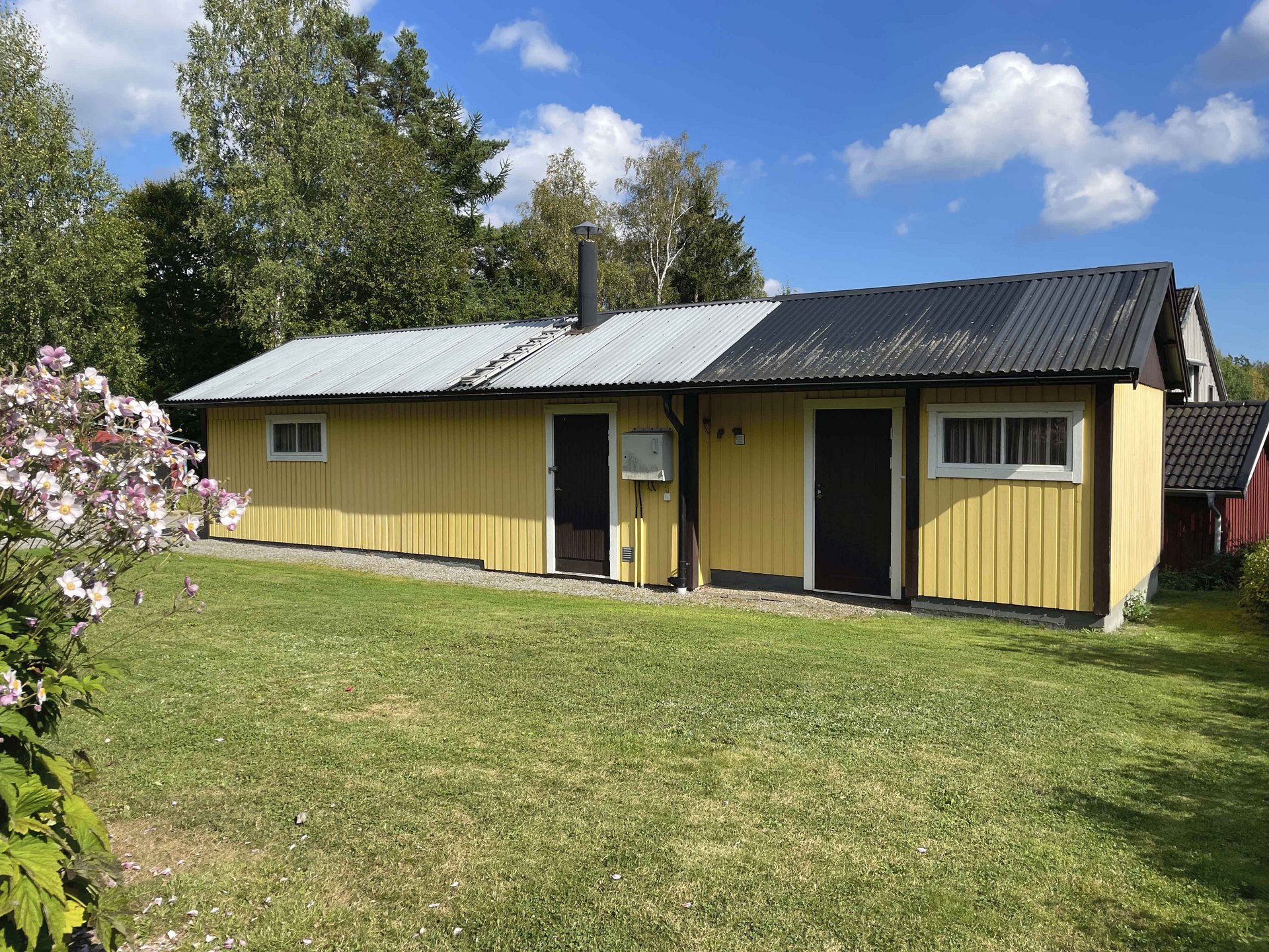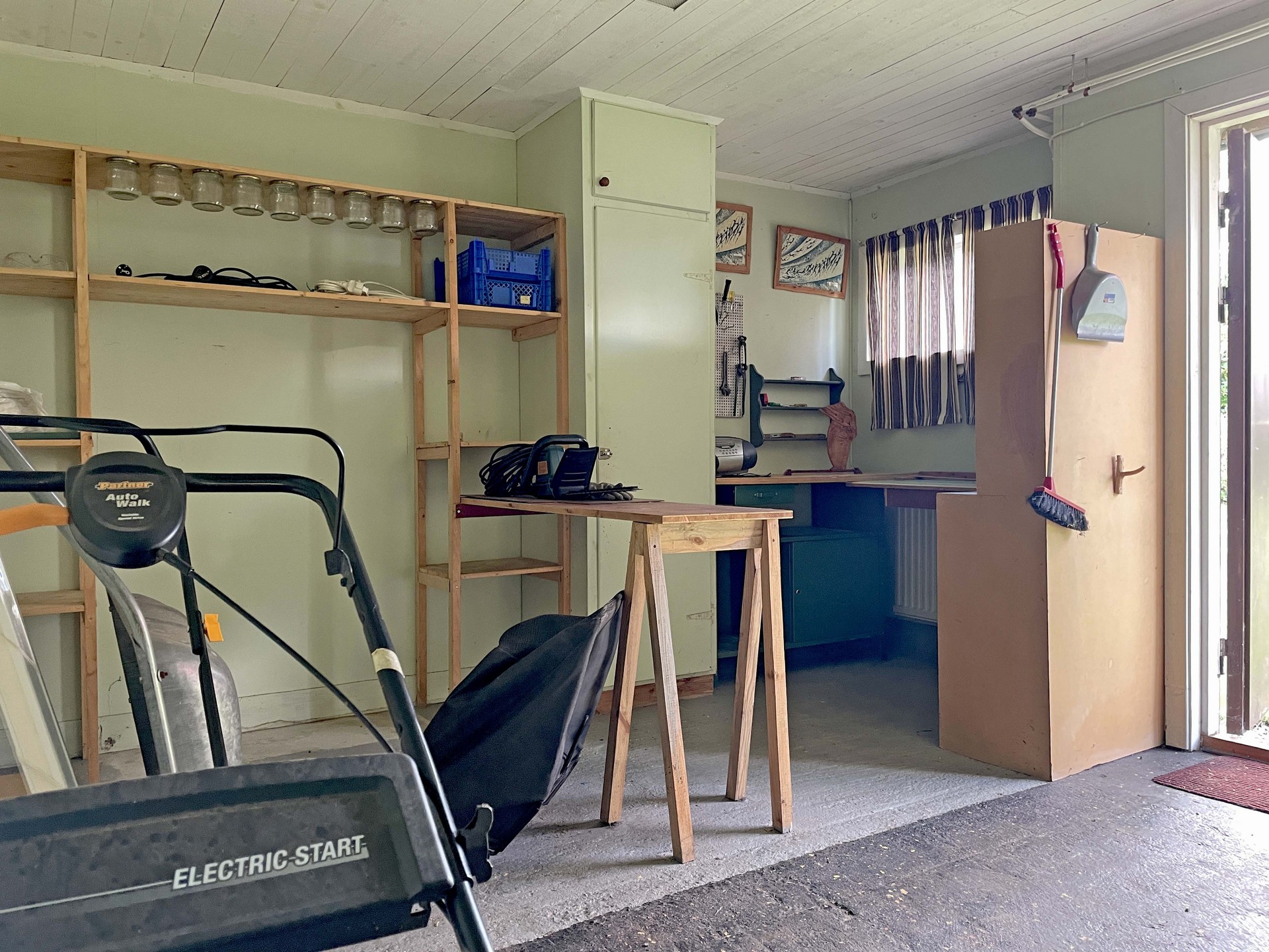 Uthus med garage, tvättstuga/pannrum samt snickarbod/förråd. Stående träpanel, plåttak, tvåglasfönster i garage och snickarbod. El och belysning. Garage med plats för en bil, gruslagt golv och panelade väggar och tak. Tvättstuga/pannrum med betonggolv. Panna, tvättho, tvättmaskin Cylinda. Snickarbod/förråd med betonggolv. Oljetank av plast står kvar.