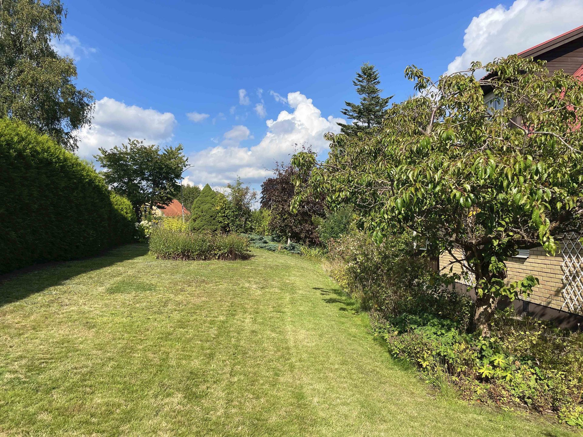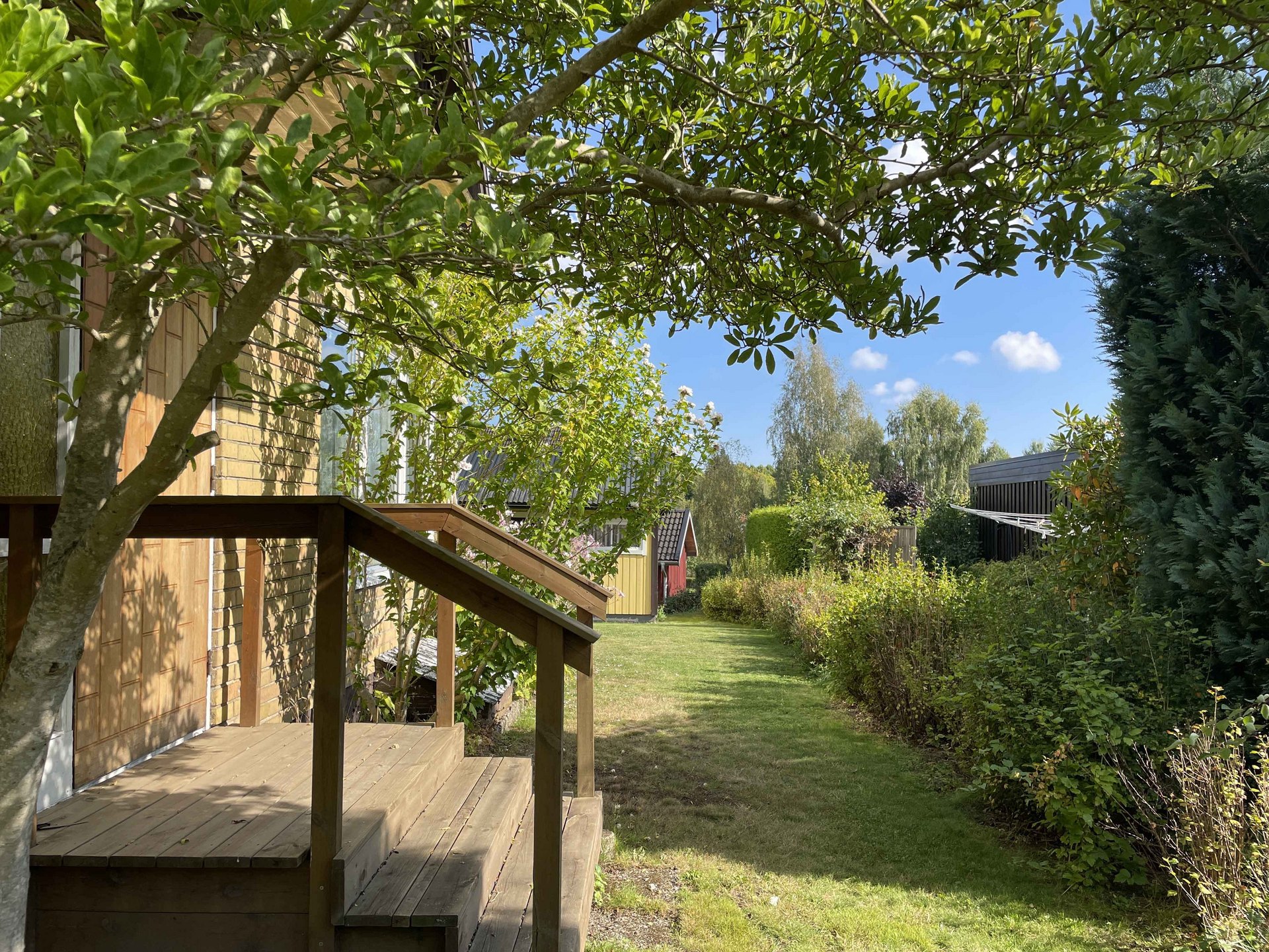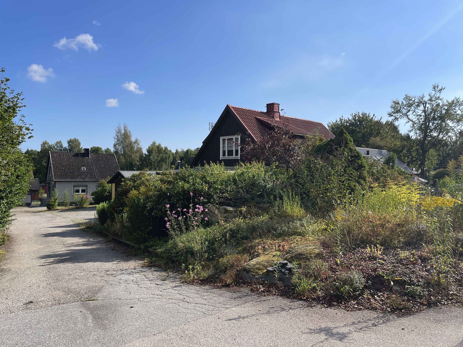 Lätt sluttande trädgårdstomt, dold med hög häck mot gatan. Gemensam infart med granne. Gräsmatta, träd och rabatter.